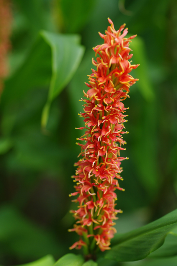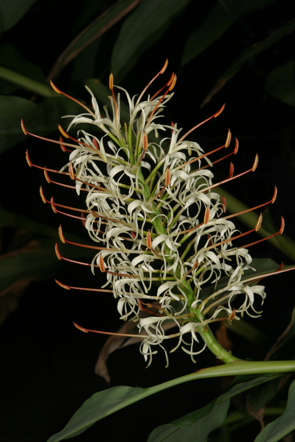 Hedychium gracile ist ein, wie der Name schon sagt, eher zierlicher Vertreter der Gattung und wartet mit reinweißen Blüten auf. Auch hier ragen leuchtend orangefarbene Staubgefäße weit aus der Blüte heraus die sehr elegant wirkt. Die Pflanze bleibt kleiner und wirkt insgesammt zarter wie H.gardnerianum, duftet aber ebenso stark und angenehm.