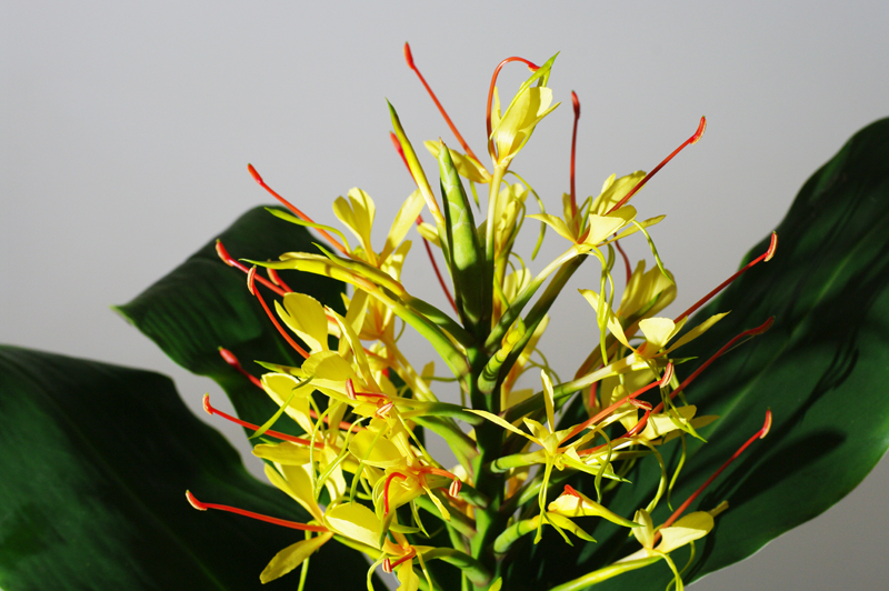 Zieringwer gehört wohl zu den absolut pflegeleichtesten Kübelpflanzen die man finden kann. Insbesondere Hedychium gardnerianum kultivieren wir schon etliche Jahre und noch nicht einmal konnten wir Schädlinge oder Krankheiten daran entdecken – sicher einer der größten Vorteile. Pflanzt man trockene Rhizome sollte man anfangs nicht zu viel gießen damit sie nicht faulen bevor sie beginnen können zu wachsen. Die Töpfe mit den Rhizomen werden bei Zimmertemperatur aufgestellt und beginnen einige Wochen nach dem Angießen zu trieben. Ab Mitte Mai, sobald der letzte Frost vorbei ist, können die Pflanzen nach draußen. Sie bevorzugen einen sonnigen bis vollsonnigen Standort und reichlich Dünger. Hedychium gardnerianum schafft eine Höhe von ca. 2m und entsprechend benötigt er auch Nährstoffe um dieses Wachstum zu bewältigen. Trocken gelagerte Rhizome blühen nach der Pflanzung häufig erst im zweiten Jahr doch erhöht das eigentlich nur die Vorfreude denn auch ohne Blüten wirkt der Zieringwer mit den großen, sattgrünen Blättern ungeheuer exotisch. Die verwendeten Töpfe oder Kübel sollten groß sein, so dass sie standfest sind denn bevor bei einem Zieringwer ein Trieb wegen Wind abbricht fällt eher der ganz Topf um. Blüten erscheinen im Spätsommer, sind haltbar und duften sehr stark.